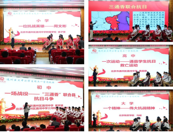 研究生与潞河中学学生联袂演绎了原创抗战话剧《运河烽火》,生动再现通州人民在抗战时期的英勇事迹,生动诠释信仰与奋斗的力量,让红色记忆在新时代焕发璀璨光芒。第二环节则为“青春诵华章:时代新人共抒报国志”,大中小学学生代表齐诵《少年中国说》,铿锵有力的诵读声响彻会场,展现了通州学子昂扬向上的精神风貌和矢志不渝的家国情怀。随后,大中小学四个学段的五位教师以“英雄·战役·运动·精神”为主线,以史为脉、以情育人,呈现了一场有温度、有深度的思政“金课”,展现了通州区思政教育一体化的深度融合与育人实效。潞河中学附属学校徐子慧老师以《一位抗战英雄——周文彬》为题,通过生动的讲述让革命先烈的形象跃然眼前;潞河中学崔安迪老师、潞河中学三河校区孙秀芳老师联袂呈现《一场战役——三通香联合县抗日斗争》,再现了那段可歌可泣的抗战历程;潞河中学蒋真铮老师以《一次运动——通县学生抗日救亡运动》为主题,展现了青年学子在民族危亡时的担当;91在线